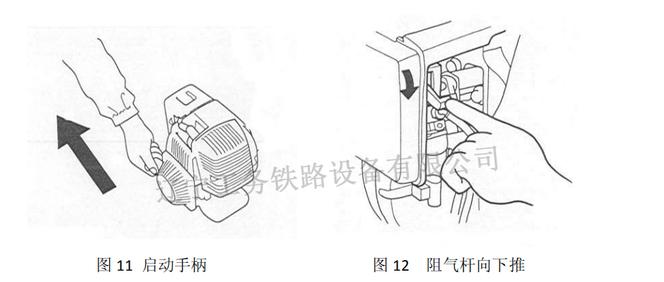 在輕輕拉啟動(dòng)手柄,直到感到有阻力時(shí)再用力拉,如汽油機(jī)長時(shí)間未使用,應(yīng)連續(xù)拉動(dòng)啟動(dòng)手柄幾次使汽油進(jìn)入油路系統(tǒng),汽油機(jī)即可發(fā)動(dòng)(見圖 11);