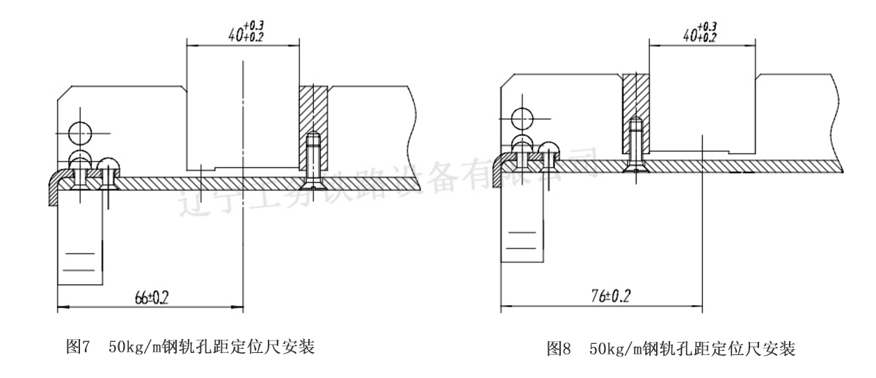 根據(jù)所鉆鋼軌類型確定鋼軌孔距定位尺安裝方式如(圖 7) 是50kg/m 鋼軌孔距定位尺安裝方式,(圖 8 )是 60kg/m 鋼軌孔距定位尺安裝方式;兩種安裝方式轉(zhuǎn)換只需卸下兩個(gè)沉頭螺釘 M5,卸下 10mm 厚定位塊,裝入另一定位槽中,擰緊沉頭螺釘即可,根據(jù)定位槽中所顯示數(shù)值 50 或 60 可判斷當(dāng)時(shí)定位軌型狀態(tài)。